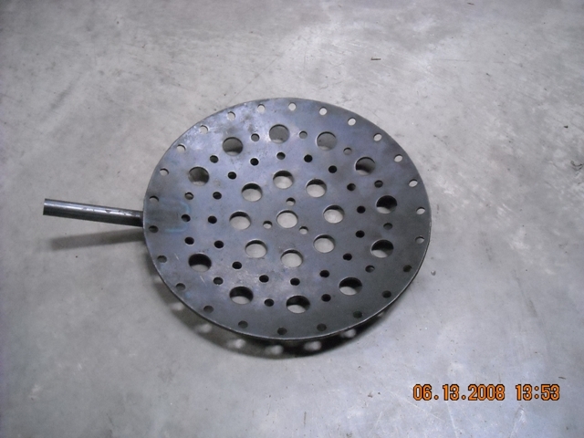 6 Inch Mild Steel Skimmer with staggered holes. Large holes measure approximately 3/4". Small holes measure approximately 5/16".
