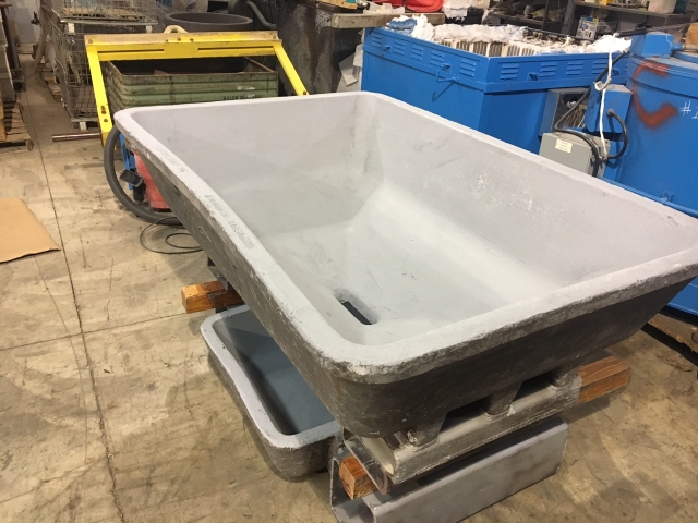 This EXTRA large mold is designed to be used with a dross press. The dross is placed into he bath tub style mold with a smal drain in the bottom. The dross is then treated with flux and the molten metal drains into the drain pan or small sow mold underneath.