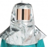 Complete head and shoulder coverage. Large 7" x 11" window opening with replaceable gold film and Lexan window. Constructed around a hard shell which provides both structure and a head ratchet. Windows are positioned far enough away from the face to allow room to wear safety glasses or a face mask underneath. Air fed supplies can be fitted into the hoods. Hard hat or cap clips can be installed, please specify. 19 oz Aluminized Para Aramid Blend